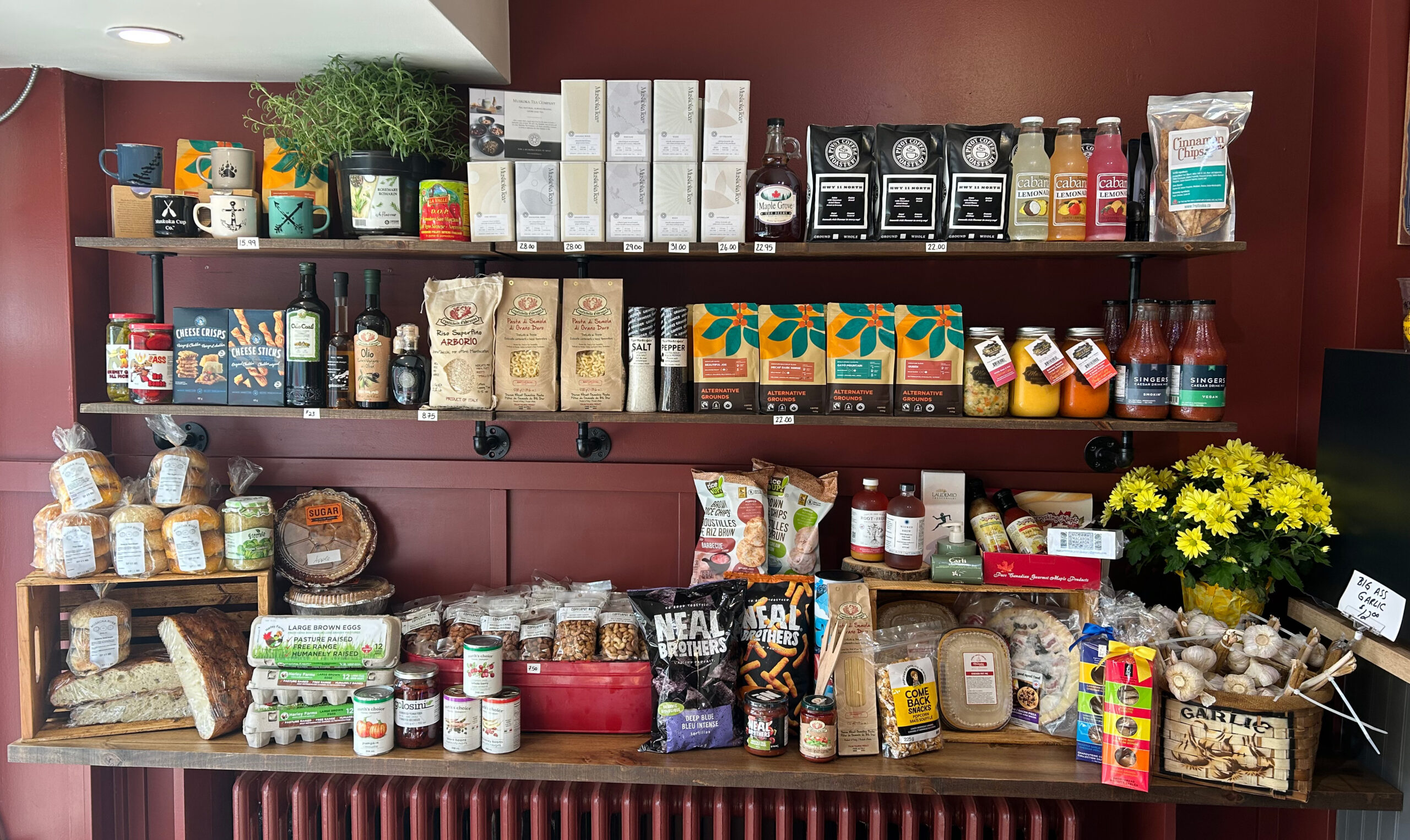 Enjoy Harley Farm eggs, meats, and pot pies, Sugar The Pastry Shoppe treats, Copperpot Nuts, Big Ass Garlic, Maple Grove syrup, Muskoka Natural Raw Honey, Wicked Brew Kombucha, Muskoka Marshmallow, Root to Fruit elixirs, Come Back Snacks, and Sprucewood Handmade Cookie Co delights.